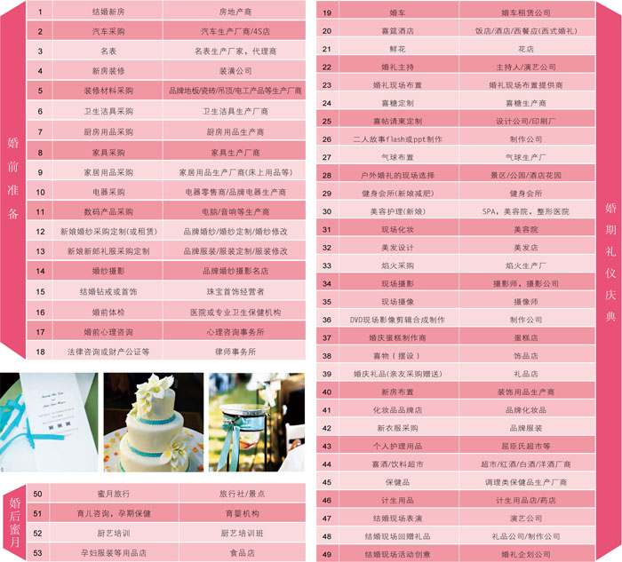 根据点今中国对于婚购市场的深入调查与多年商业经验积累,发现结婚主题下的产业非常丰富,多达70多种,涵盖了婚前(恋爱交往)、婚期(婚礼)、婚后(蜜月期)三大阶段。
